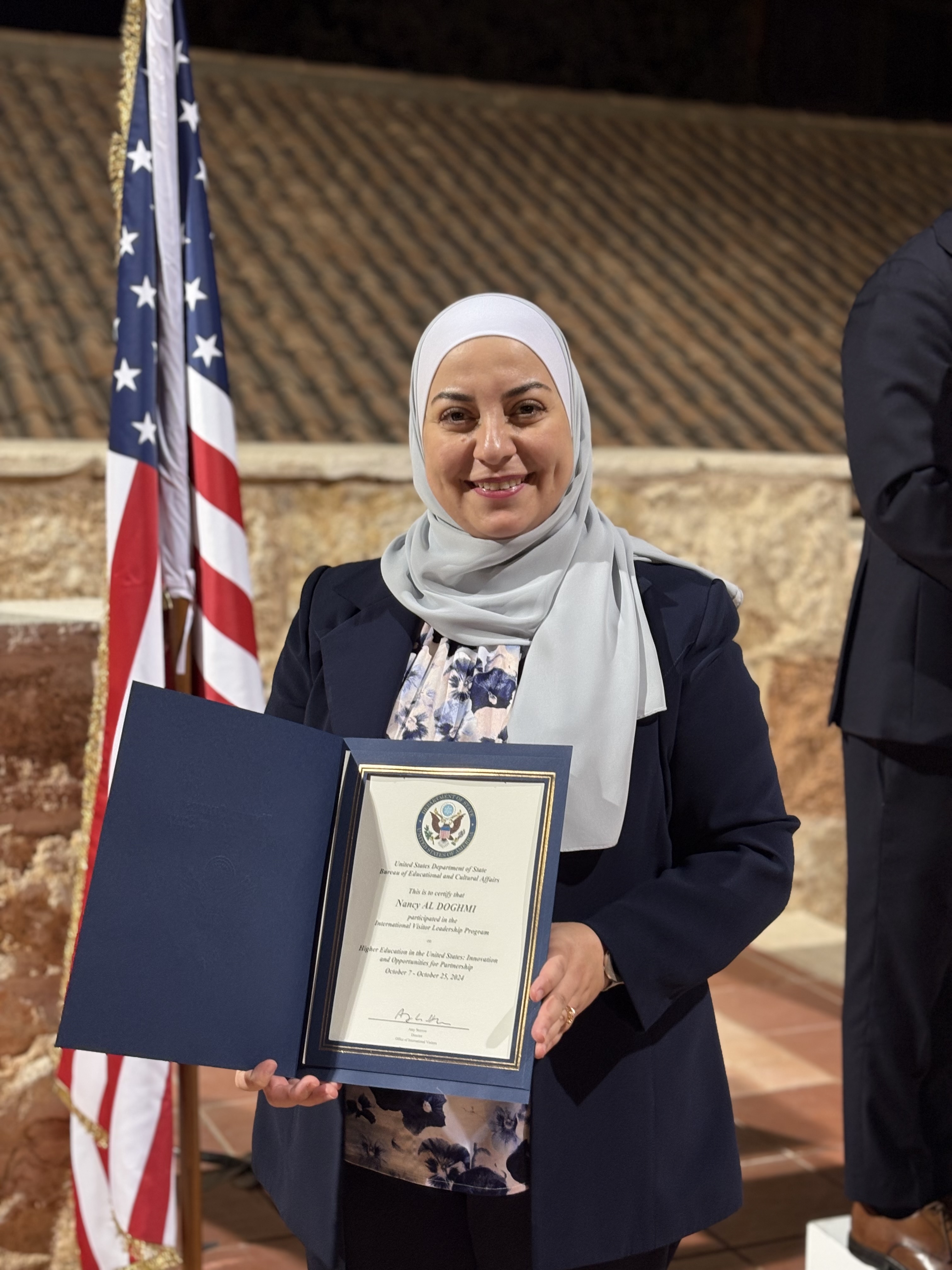 شاركت الدكتورة نانسي الدغمي من قسم اللغة الإنجليزية وآدابها في كلية الآداب، بالحفل السنوي الذي أقامته السفارة الأمريكية في عمّان لتكريم الخريجين اللذين شاركوا في برنامج القيادة للزائر الدولي IVLP الذي ترعاه وزارة الخارجية الأمريكية.