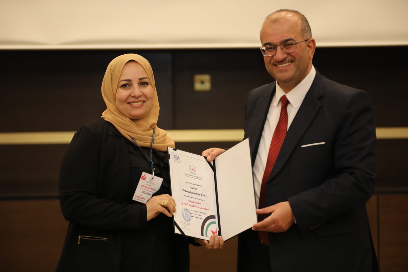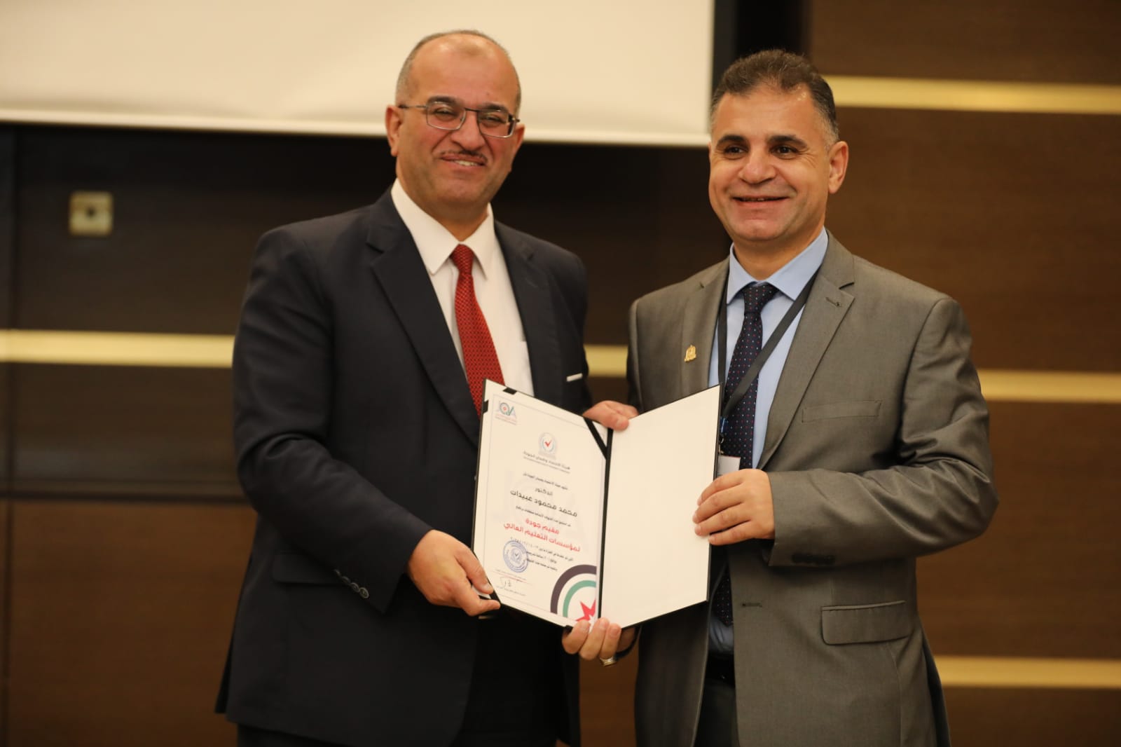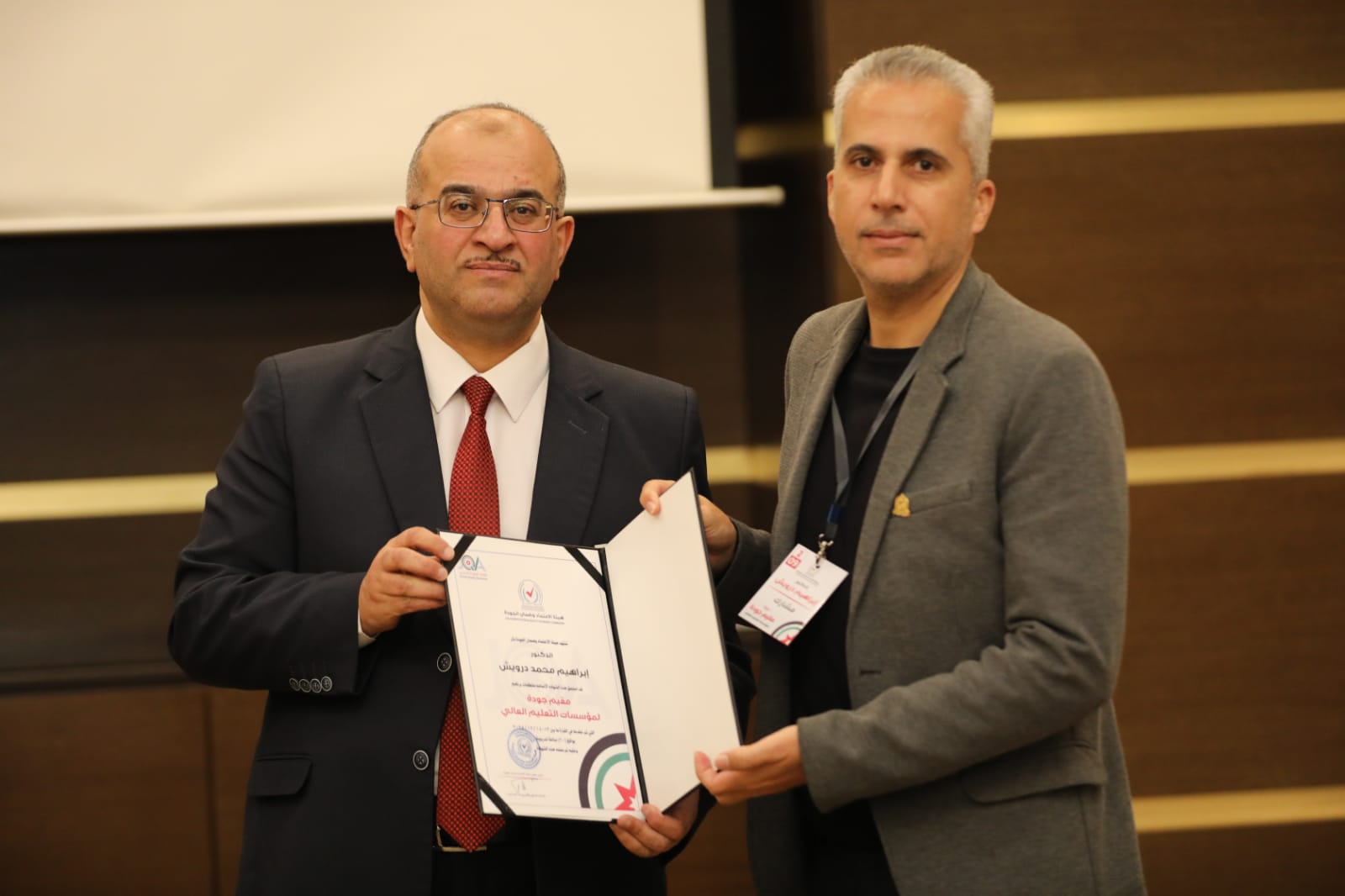 شارك كل من الاستاذ الدكتور محمد عبيدات و الدكتور ابراهيم درويش والدكتورة رائده الرمضان من قسم الترجمة في دورة مقيم جودة والتي عقدتها هيئة اعتماد مؤسسات التعليم العالي الاردنية في العاصمة عمان. وقد قام الاستاذ الدكتور سعد بن محمد نائب رئيس هيئة اعتماد مؤسسات التعليم العالي بشكر المشاركين من مختلف الجامعات المشاركه وتمنى لهم التوفيق. كما قام بتسليم الشهادات في احتفال كبير.